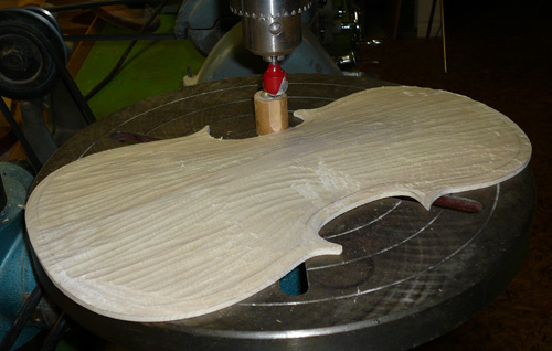 My notebook says to route the perimeter "using a guide". Of course a thorough search of the shop did not turn up an appropriate guide, nor does my memory tell me what it should look like. So I made a new one from a dowel clamp. Since one only gets one chance at this, setup is critical. Using analog calipers and thickness gauges, I got pretty close to the proper offset and depth. Unfortunately the throat dimension of the drill press is a bit less than required to fully guide the workpiece around the guide pin, especially at the "C" bouts.
