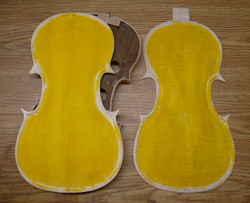 While looking for colours and violin varnish, I came across a bottle of mixed yellow stain. It was the work of only a couple of minutes to apply it to both plates on violin #6. Once I have the repair under control, I'll get back to my own instrument. The next step is to finish-sand the outsides of the top and bottom plates. The yellow dye helps highlight inconsistencies.