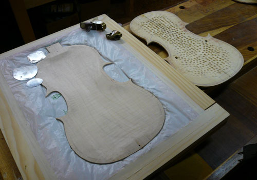 After several weeks of inactivity due to work commitments, I finally finished cleaning out the inside of the back. The plaster mold worked very well. It held the back firmly in place, allowing fairly aggressive wood removal. Even without clamping the frame, just laying it on a rubber mat, the mass kept movement to a minimum. However, clamping the entire assembly to the workbench was even better.