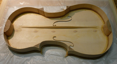 Hide glue is very brittle. All it takes is a bit of shock loading to break the bond. A few light taps on a chisel inserted in the joint between the rib blocks and the form are all it took to loosen the rib garland. Pulling out the form was then simple.