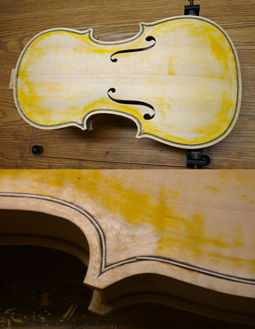At the end of the day, I had finished trimming the exposed excess purfling. Next I well scrape the perimeters to achieve a nice smooth valley.