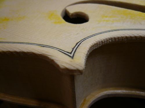 Again, not much obvious progress. I spent a couple of hours applying a 45 degree bevel to the upper and lower perimeters. I used a sanding stick, being careful to maintain both a consistent angle, and a consistent width. I think that the inner (rib-side) part of the edge will still need to be rounded some more.