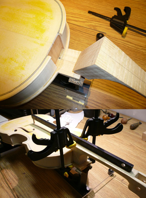 Once I was satisfied with the fit, I mixed up a new batch of hide glue, with a fairly thick consistency. I used two small clamps so that I could set the alignment gauge between them for a final check on the angle.