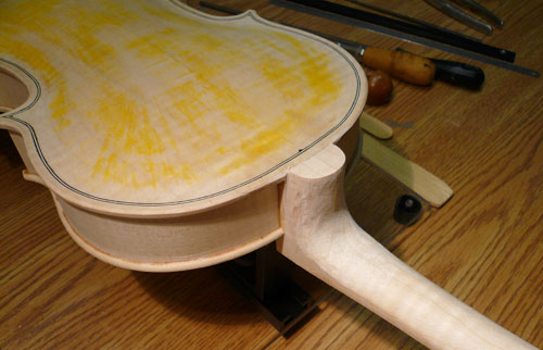 I spent all morning removing excess wood from the heel of the neck. First I laid out the