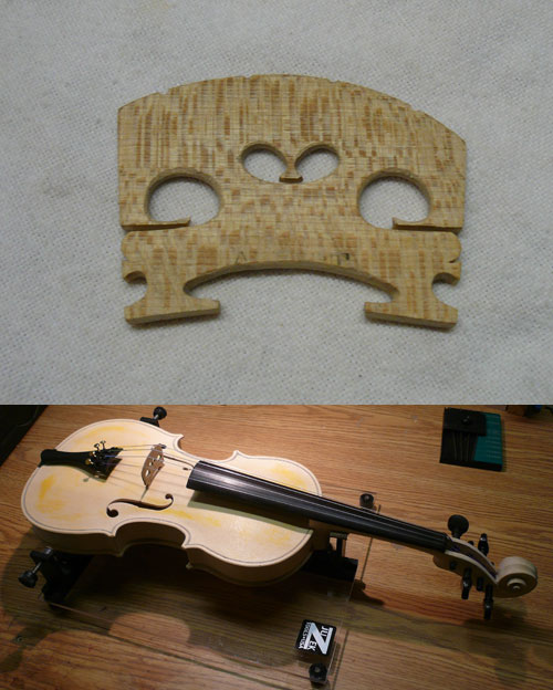After lunch I had a spare half hour, so I fitted a test sound post and installed the strings. Unfortunately the "A" peg wouldn't hold, so I wasn't able to tune it up properly. Even so, I did play a few notes, and so far the sound is pretty good.