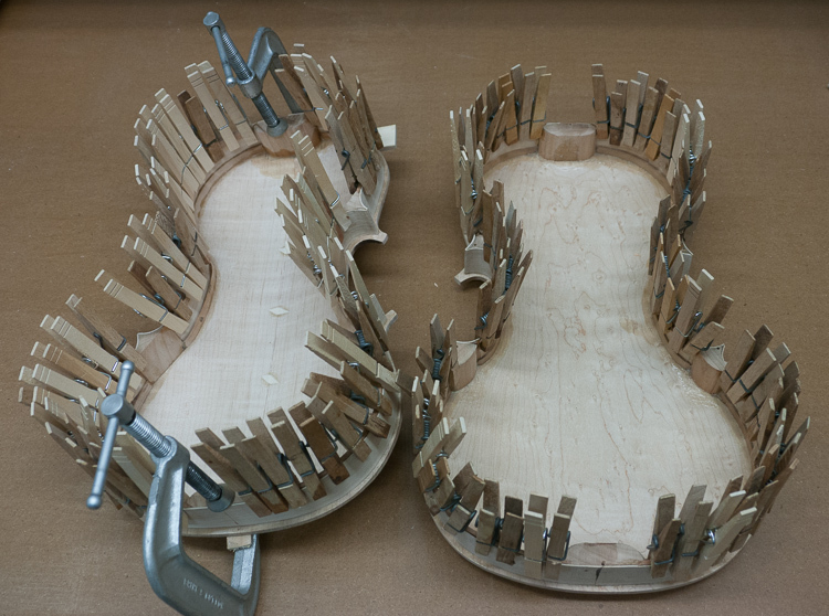 Applying the linings is more finicky work. In addition to the pieces being small, their length must be very accurate, and the glue mustn't get on any exterior surfaces. I started by cutting a notch in the corners of each block to act as mortises. Then I soaked in warm water the lining material I had prepared last year. Next I cut each lining piece to length and glued it in place. Clothes pins, applied as densely as possible, hold the lining material to the ribs. I cleaned my fingers after each one.