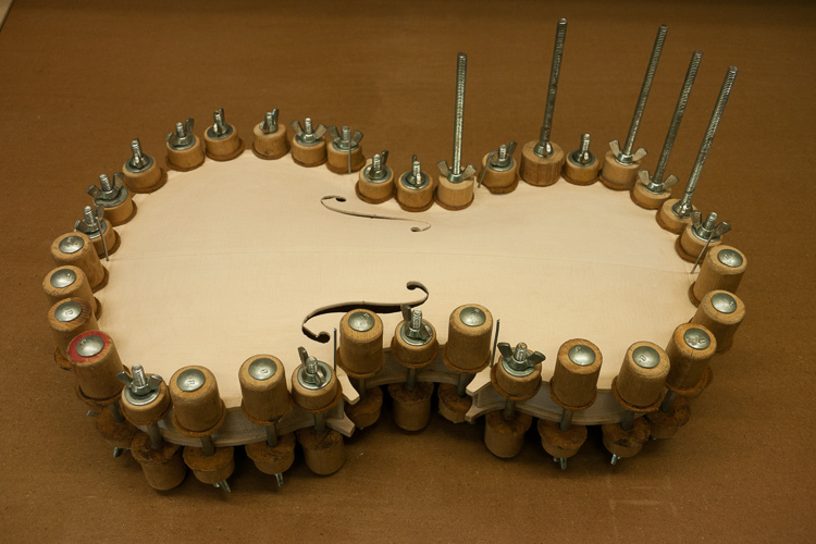 Another short day in the shop. I only have enough clamps to glue one plate at a time. Today it was the large violin's turn. With fairly fluid glue, I brushed the linings and blocks quickly but carefully, followed as quickly as possible by the edge of the belly plate. I inserted all six alignment pins and applied the clamps as quickly as possible. I started with the ends and C bouts, then filled in from there.