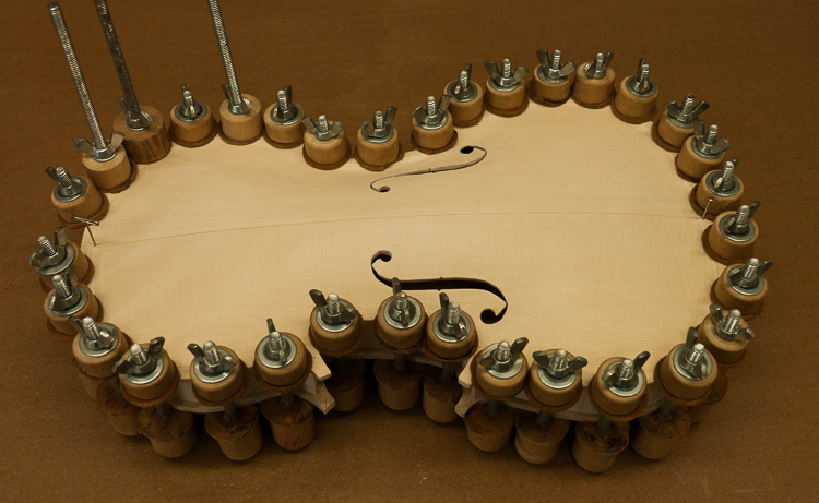 Gluing the top on the Sinister didn't take even as long as for Ashley's instrument. I still had to use three of the longer clamps. At some point there were enough, but several have gone astray. I will have to make a new set at some point.