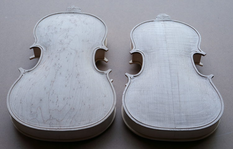 This past week has been busy with other things, so I finally returned to the fiddles today. I had removed the clamps a week ago. Today I cleaned up the overhangs of the top and bottom plates. I used a disc sander, a small drum sander, and a sanding stick. The overhangs aren`t consistent, but they are more so than right after gluing on the plates.