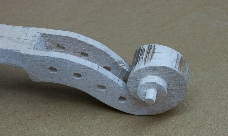 It's been a long cold winter. Since I only keep enough electric heat in the shop to keep the fiddles happy, I have not been out to do any work. This afternoon was bright and sunny, and the shop was fairly warm. So while I procrastinated from a client job, I worked on the first scroll.