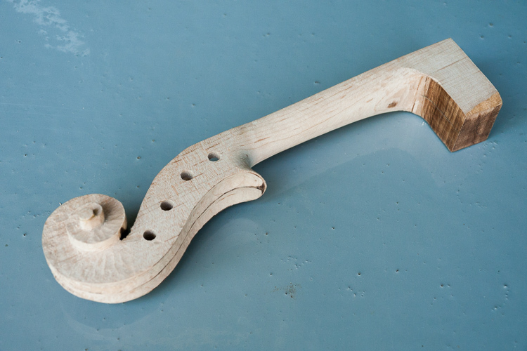 The first scroll is coming along nicely. A week ago I carved out most of the volute and rounded the neck. Today I dished the back of the scroll. It will all still need to be scraped and sanded, but the basic form is in place.