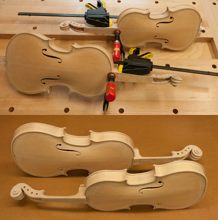 The mortise on Ashley's went very well also, with only a bit of damage to the rib material. I was able to glue the damaged sections and sand out the evidence. Today I mixed up a new batch of hide glue and prepared the clamps. I did the Sinister first, and it went fairly well. There's a bit more glue than is necessary, so there was some squeeze-out. Ashley's went together even more smoothly. I used two clamps on each to apply pressure both vertically and longitudinally. After leaving the assemblies for about 5 hours, I removed the clamps and checked the alignments. It's difficult to check alignment with the clamps in place, but it turns out that everything is almost perfectly right. The neck on the Sinister could stand to be a bit lower on the right, but I can compensate with the fingerboard.