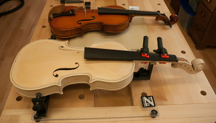 I adjusted the thickness of the Sinister's fingerboard using a belt sander. The nut I also sanded into shape, using a small belt sander given me by my friend Andris. To hollow out the underside of the fingerboard I used a Lee Valley Veritas Detail Palm Plane. To tack on the fingerboard I used two very small spots of weak hide glue. I will still need to do final matching adjustments on both the fingerboard edges and a bit of the neck to ensure a clean transition.
