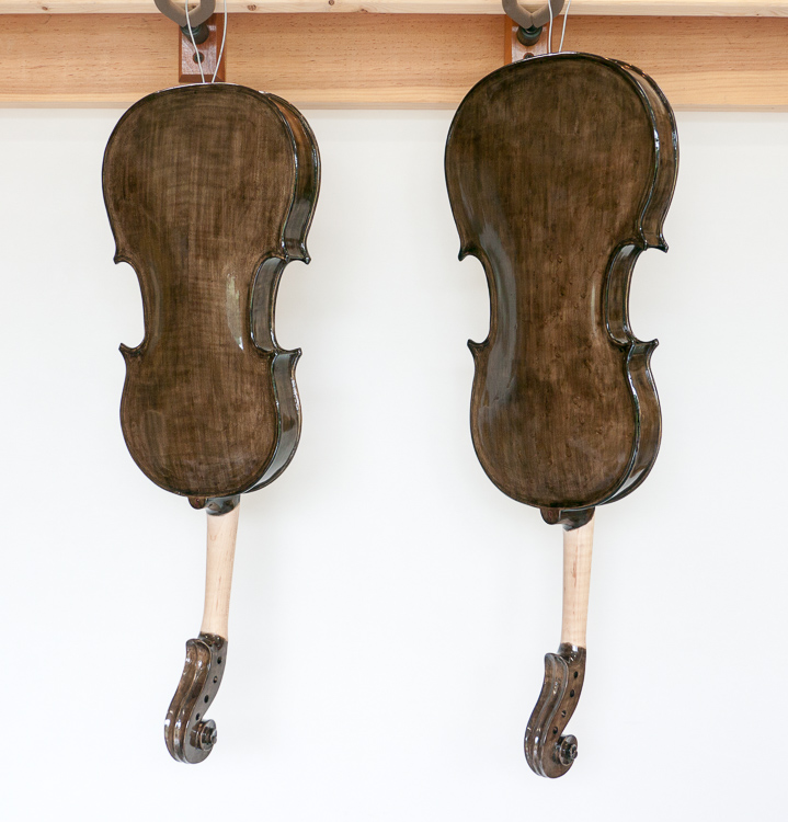 The weather has been cool and rainy, but there was one hot sunny day in which I had the fiddles hanging out for a few hours. This morning I gave them both a careful and full sanding. The varnish had thickened quite a bit, so I diluted it with the turpentine which I had been using for cleaning the brushes. It went on well, but despite the humidity started drying quite quickly. I made sure not to have any dribbles.