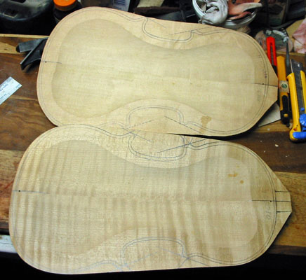 The top and back plates have been marked for the proper shape. Note the offset line around the perimeter, and the neck tab marked on the bottom plate.