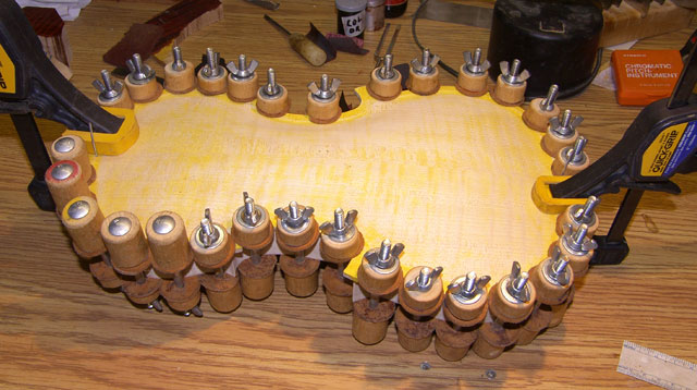 The bottom plate has been glued to the ribs. Locator pins have been inserted in guide holes at either end.