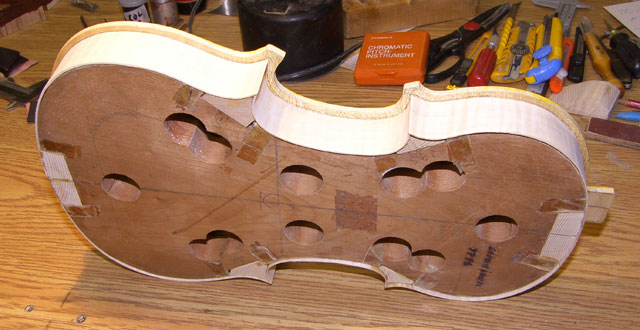 The bottom plate is now glued to the ribs, while still in the form. This ensures that the desired form is maintained.