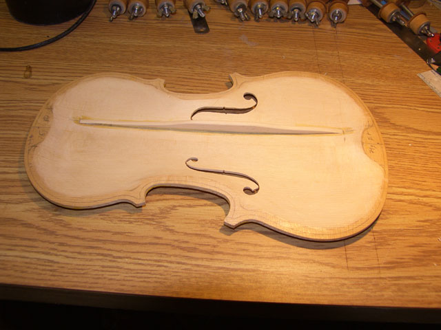 The bass bar bas been shaped to 14mm in height at the middle, reducing to about 2 mm at each end. The weight is now 79g, the tuning is a little sharp of E.