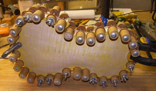 The top has been glued to the ribs, using steel pins as guides. The guide holes will later be filled with ebony pegs.