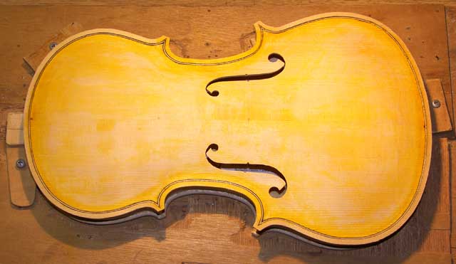 The top purfling was likewise cut to length and shaped, but installed dry. Thin hide glue was then applied, being soaked into the porous spruce. Even with a "dry" insertion, this is very fiddly work.