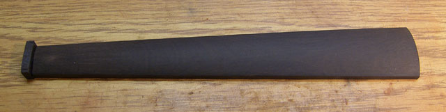 The nut is cut to the proper width and a slight extra height. It is then glued to the finger board, which has been previously shaped on both top and bottom for proper string clearance and weight.
